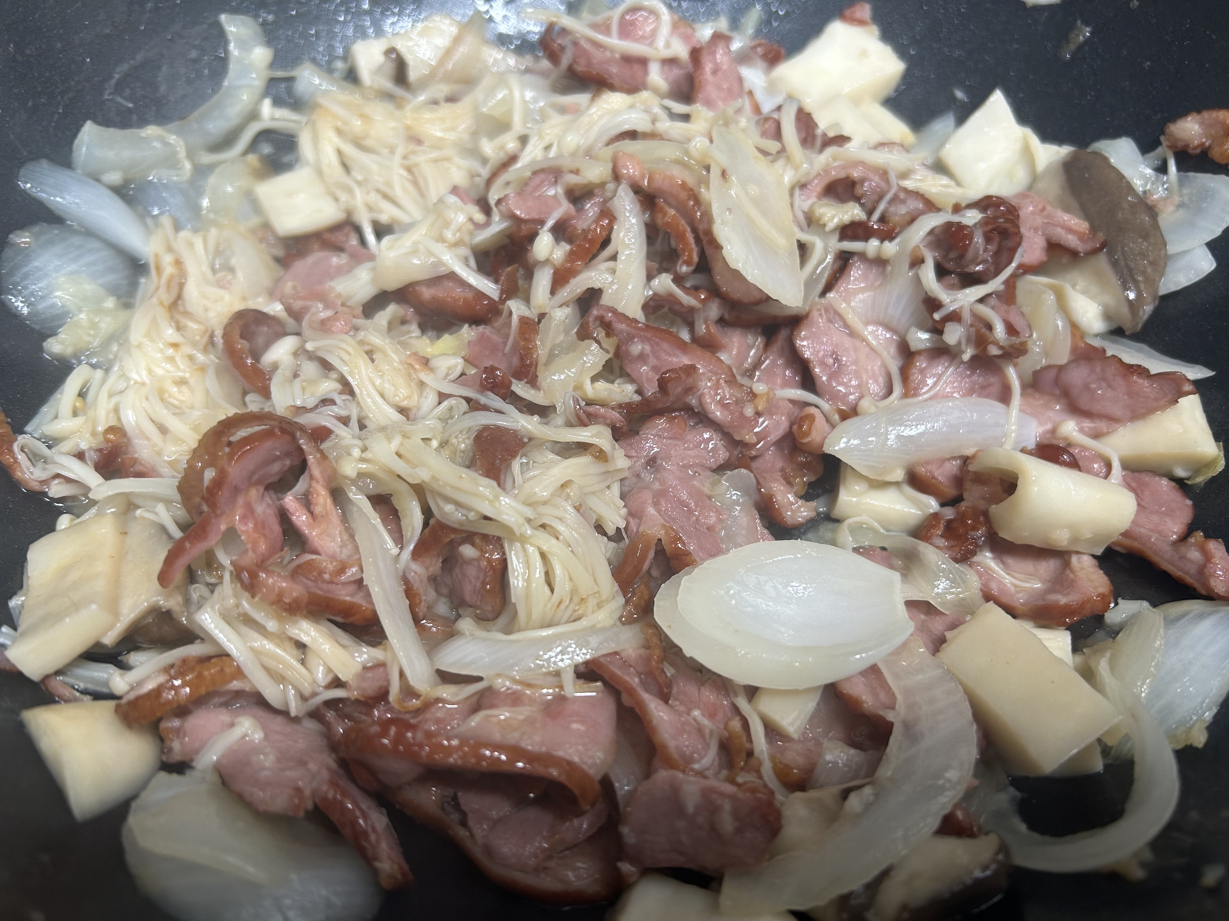This is a quick and hearty Korean stir-fry made with smoked duck (Hunje-Ori*훈제오리), onions, and mushrooms.