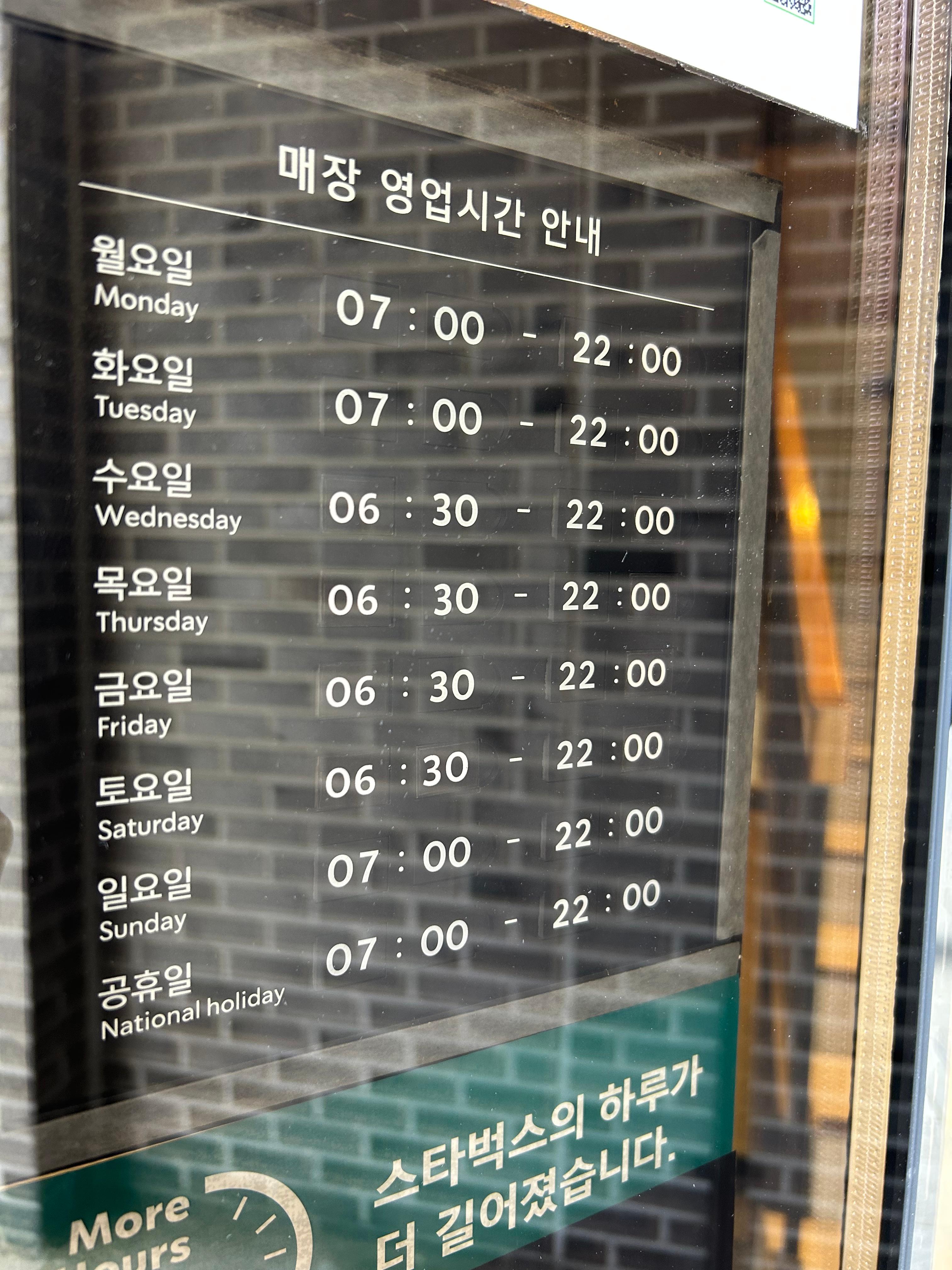 - 오픈시간: 일–화, 공휴일 07:00 / 수–토 06:00