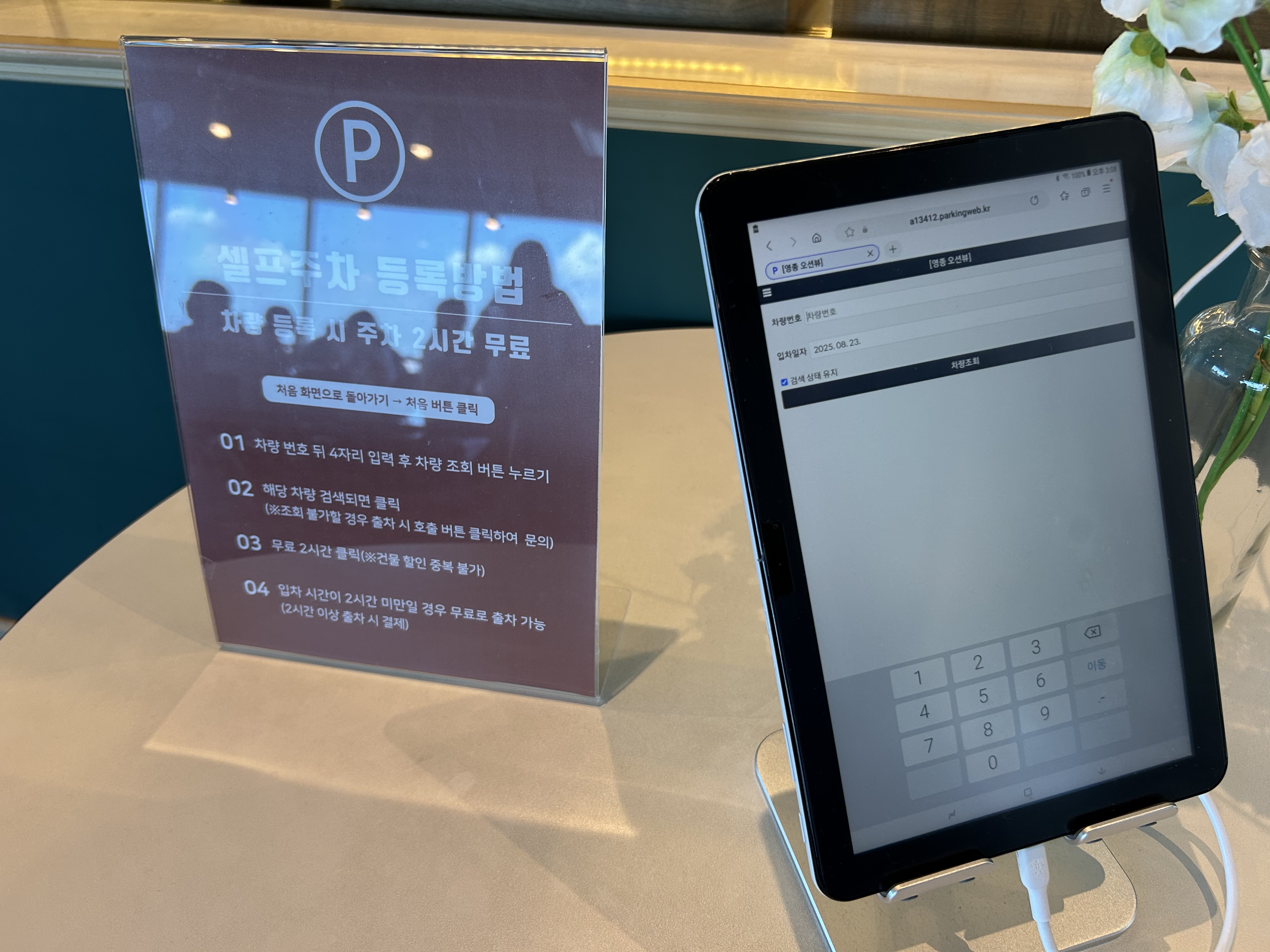 주차는 카운터에서 셀프 등록 후 편리하게 이용할 수 있습니다.