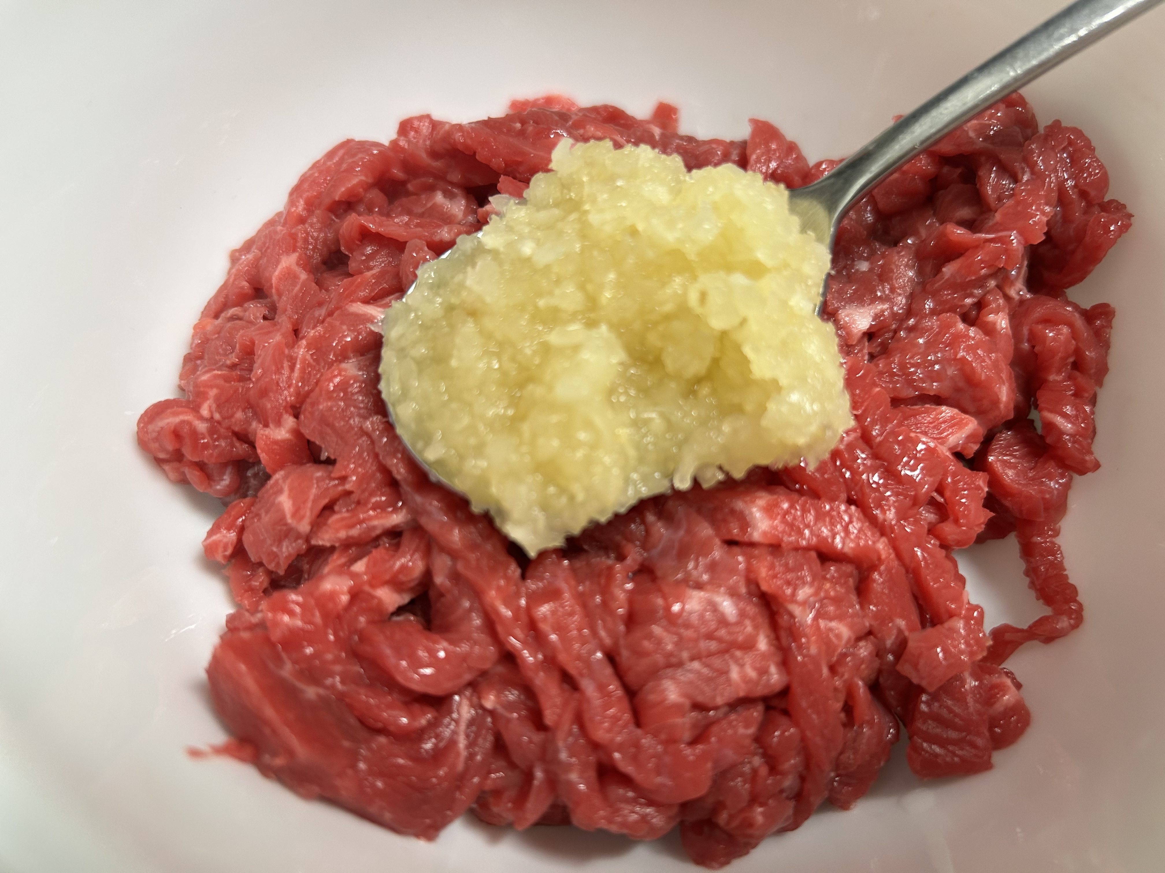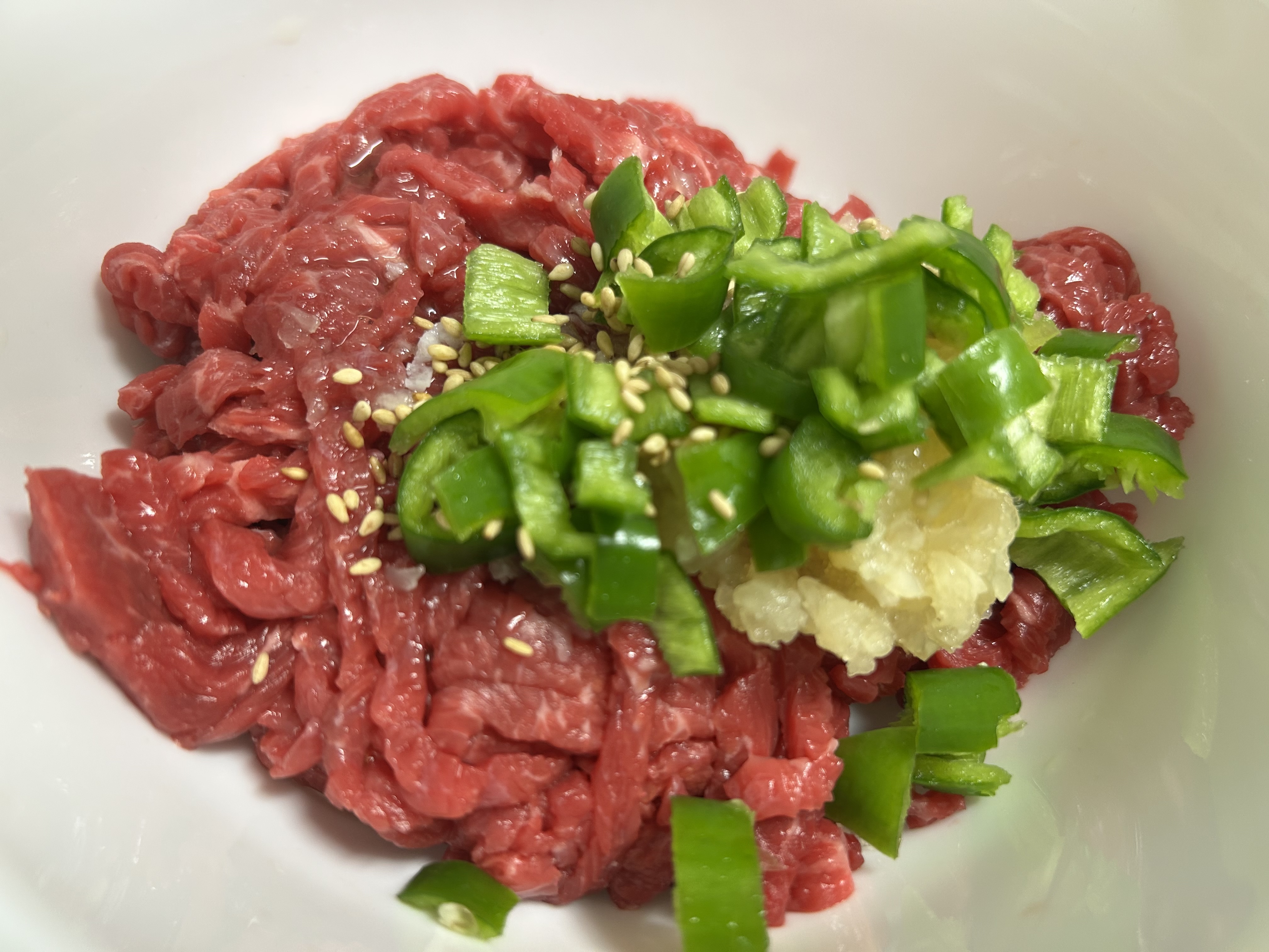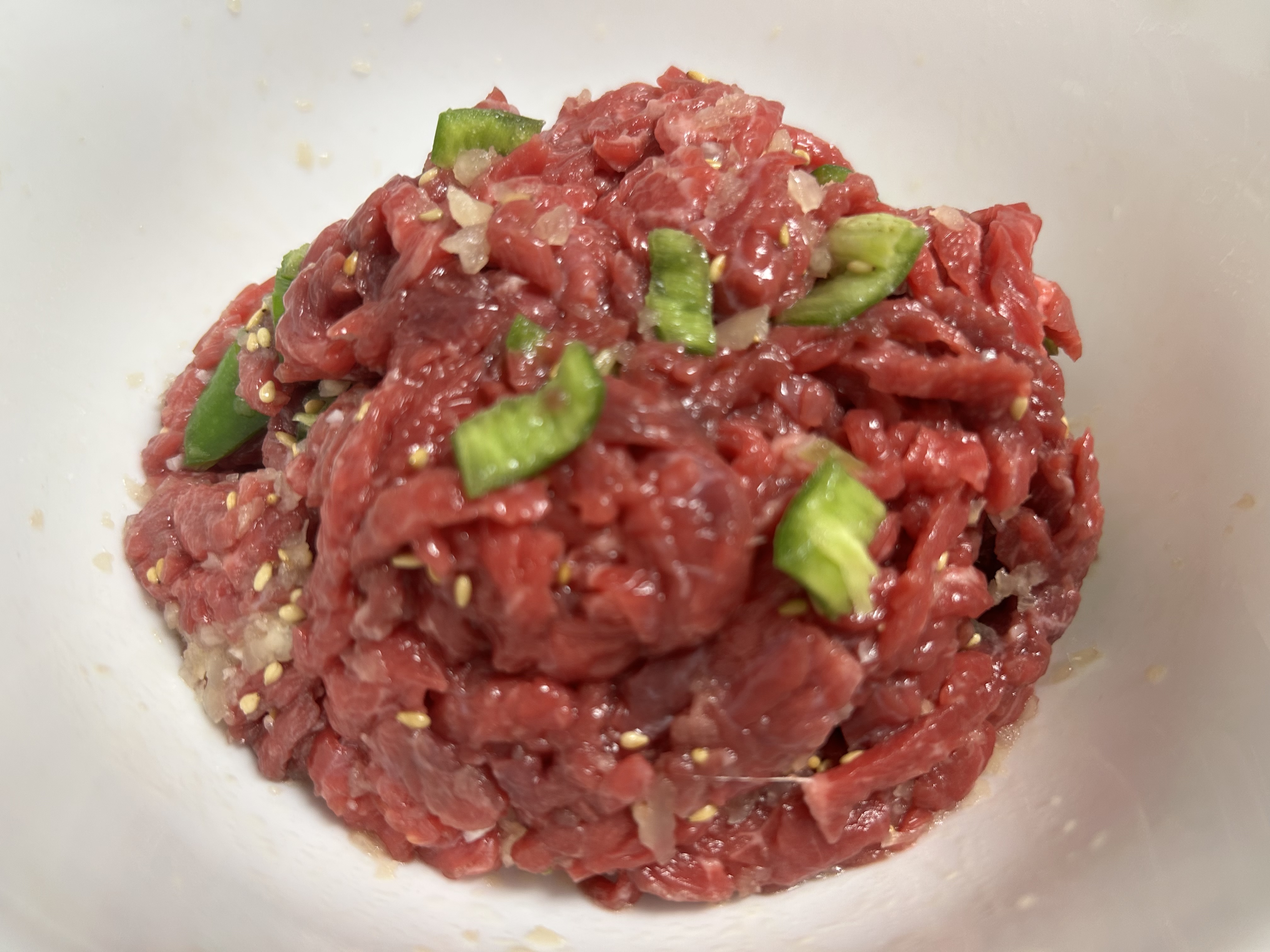 This is a simple Korean-style beef tartare made with fresh Hanwoo beef, seasoned lightly with garlic, sesame oil, and salt.