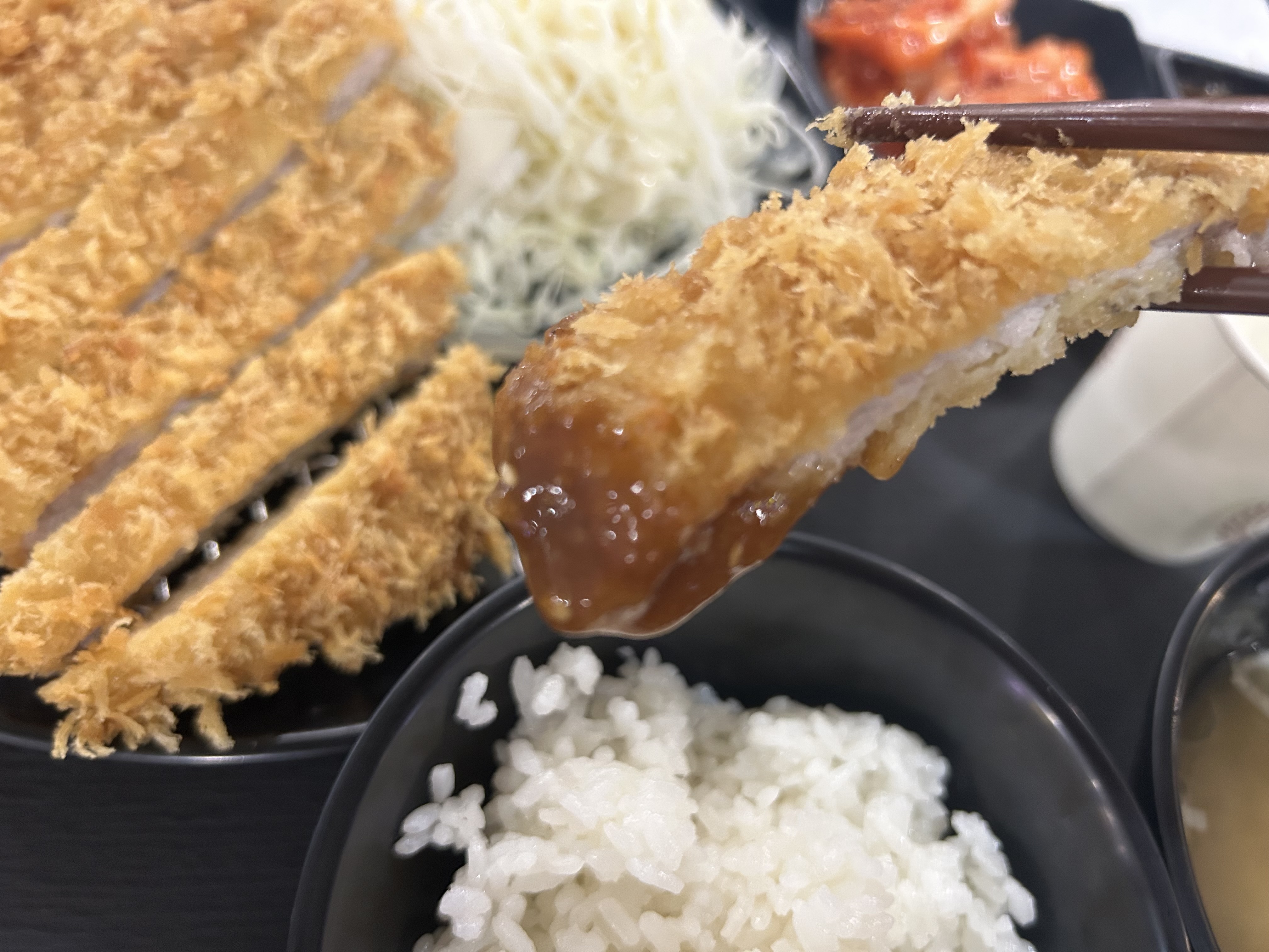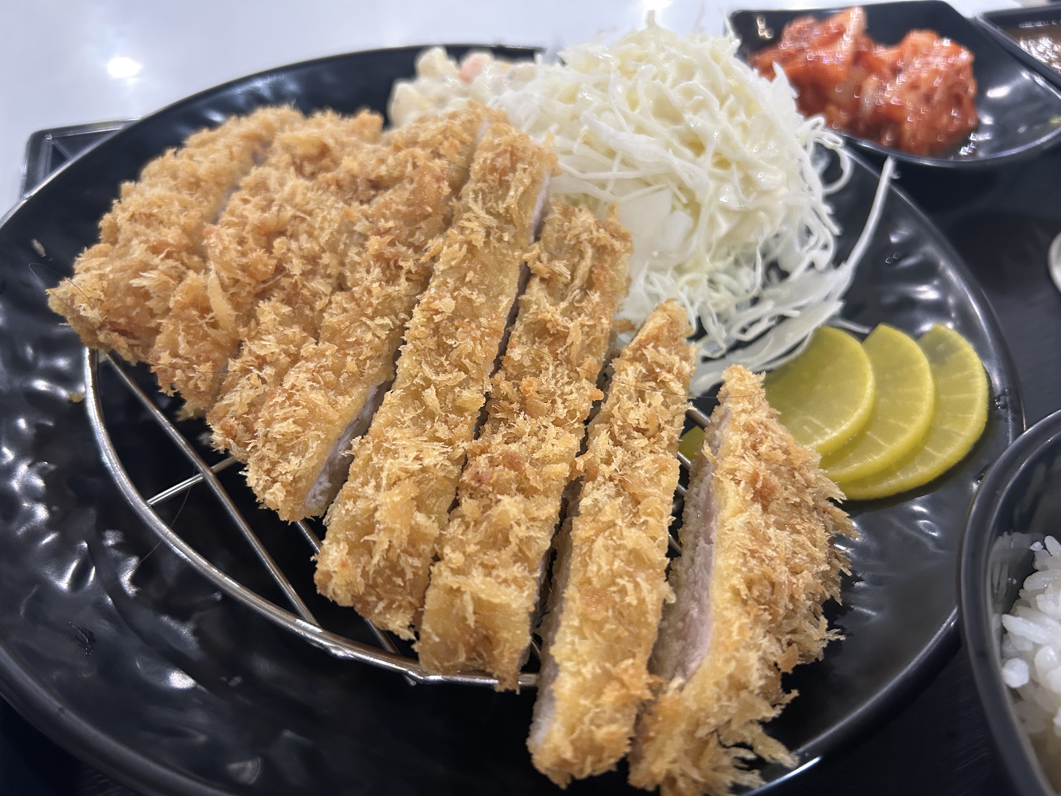 The classic pork cutlet set starts at just ₩6,500 and includes thick, juicy meat, crispy breading, and a generous side of cabbage salad.